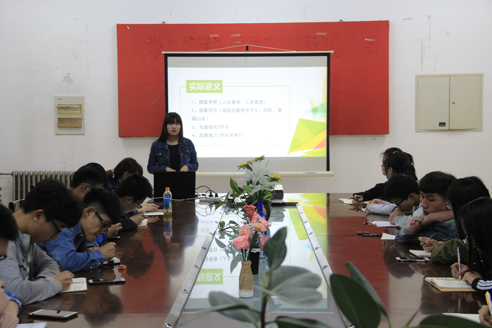 会议伊始,王福香就实践意义对社会实践进行简单介绍:在班级考评上要本着人无我有,人有我优的原则设计并完成社会实践;创新学分要从省级实践优秀学生、团队,调研山东等方面获取;参与社会实践可锻炼带队与实践能力。