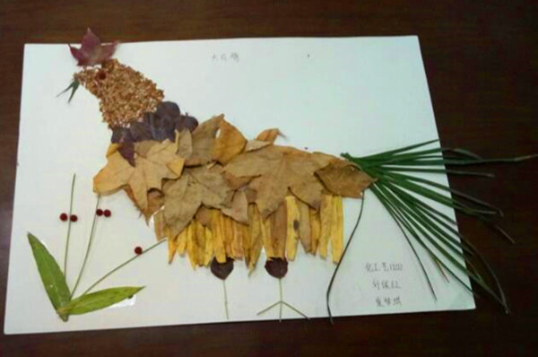 化工艺1502刘保红和崔梦琪用秋日落叶制作的大公鸡活灵活现,几片叶子的拼凑,让一只大公鸡身体的每一个部位都栩栩如生。