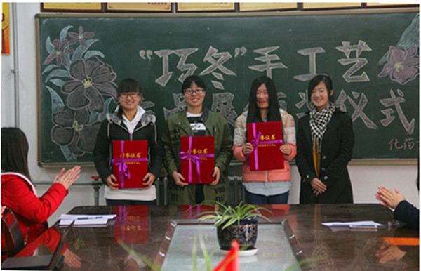本次手工艺作品展化工艺1501巩克慧的素描作品、化工艺1502刘宝红两人的《大公鸡》和121宿舍的《温馨小屋》荣获一等奖,学院学生会党员工作部部长范凯梅应邀出席并颁奖。本次手工作品展由学院学生会女生部主办,范凯梅与女生部部长吴言凌出席颁奖仪式。