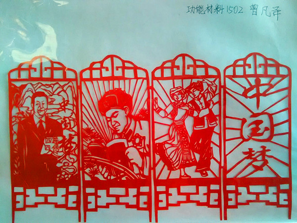 其中一幅《中国梦》最为引人注目,剪纸中有习近平、雷锋和两个少数民族少年。它的作者是功能材料1502的曾凡泽,曾凡泽对记者说:“我认为我们青年学生应继承发扬雷锋精神,维护民族团结,同时从实现自己的一个小梦开始,以实现整个中国的大梦!”