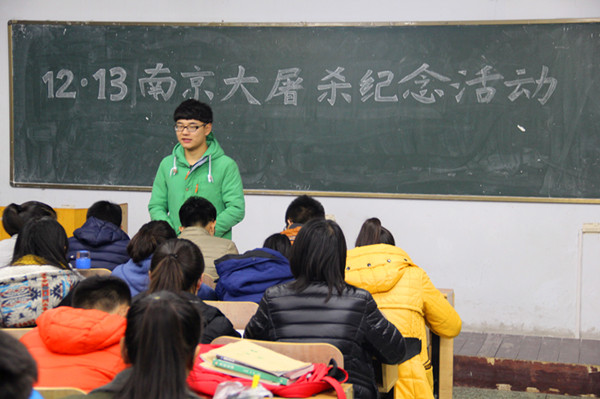 “1937年12月13日,日军进驻南京,随后进行了长达六周惨绝人寰的大规模屠杀,遇难同胞30余万人!”化学工程与工艺1502班团支书石凯悦愤慨的说到。