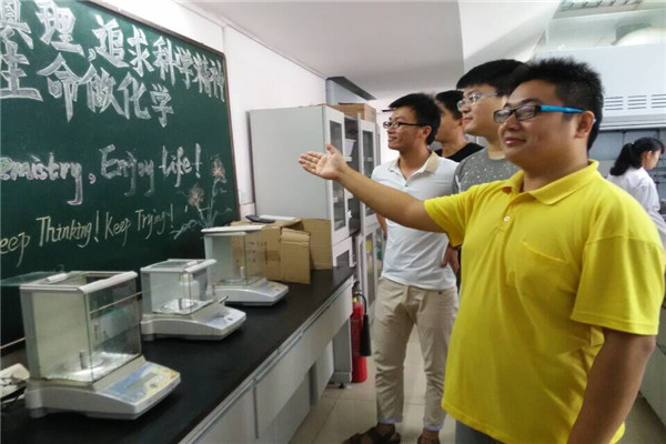 从化学楼到教学楼再到专家楼,从牡丹园到虹子湖再到知音广场,同学们对农大校园赞不绝口。随后,大家一起到各个实验室参观并了解各实验室的特点和文化。在到分子催化与转化实验室时,“探索科学真理,追求科学精神,燃烧生命做化学”的标语吸引了很多同学驻足。从实验室相关人员的介绍中得知,这是学校引进的高层次人才肖建教授为实验室确立的团队精神。