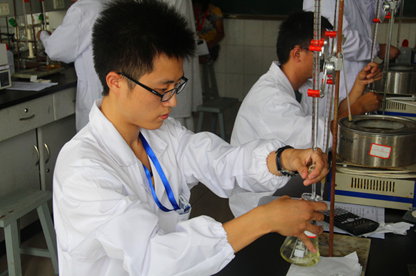 8月9日下午,大赛笔试在青岛农大教学区进行。笔试主要考察化学实验常用仪器、药品、基本操作、实验安全等方面的知识。参赛选手在笔试中应答自如、沉着冷静,展现出扎实的理论知识基础。实验操作竞赛于8月10日在化学楼进行,选手的实验操作能力成为考察的重点。实验操作题目在大赛开赛后现场抽取,参赛选手自行设计操作过程,操作的步骤、规范、实验数据等都在监考老师的全程监督下进行。仔细的称量,熟练地仪器操作,参赛选手各显绝技,展现出自我扎实的实验操作技能。