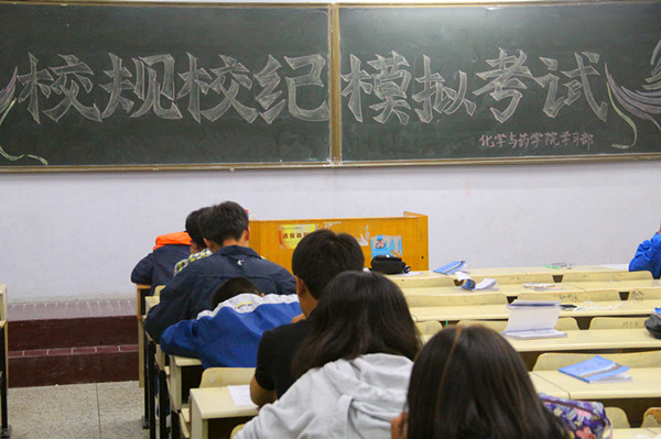 9月11日,化学与药学院于教学区举行2015级新生校规校纪知识模拟考试。本次考试分为七个考场,由各班班主任助理和学生会成员监考,15级全体新生参加。