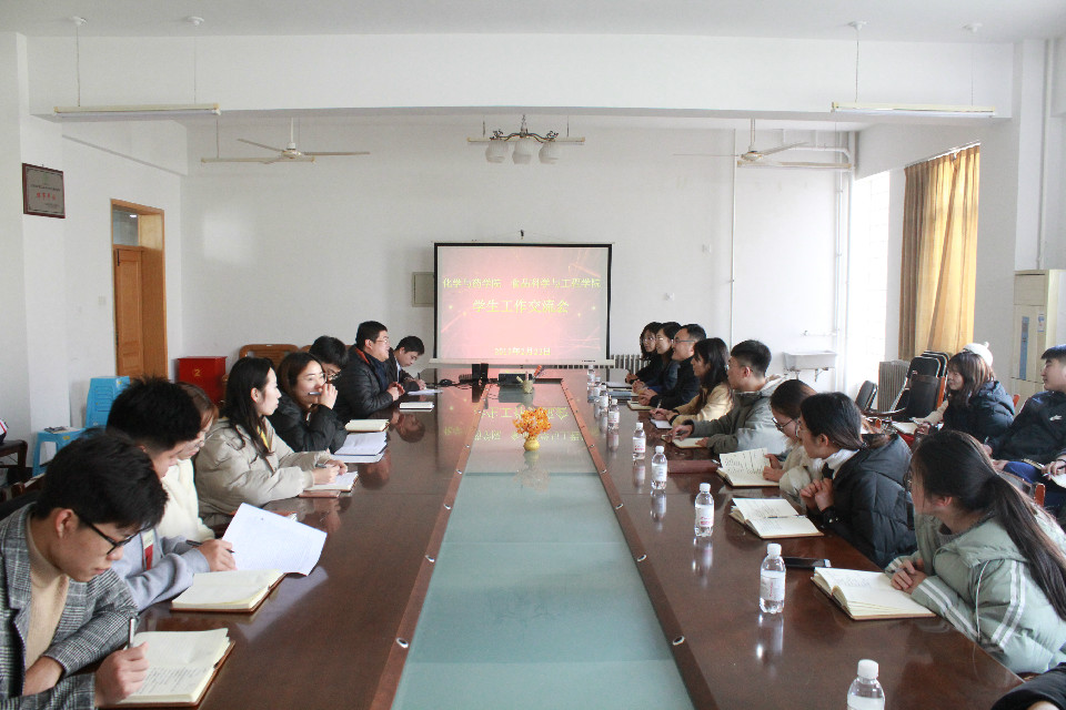 2月23日,青岛农业大学化学与药学院和食品科学与工程学院于化药学院会议室召开学生工作交流会。化药学院党委副书记、正科级辅导员杨冬冬出席,食品学院团委书记李永青,正科级辅导员赵莹、孙晓东,辅导员江巧宁代表出席,两学院学生会各部门代表与会。