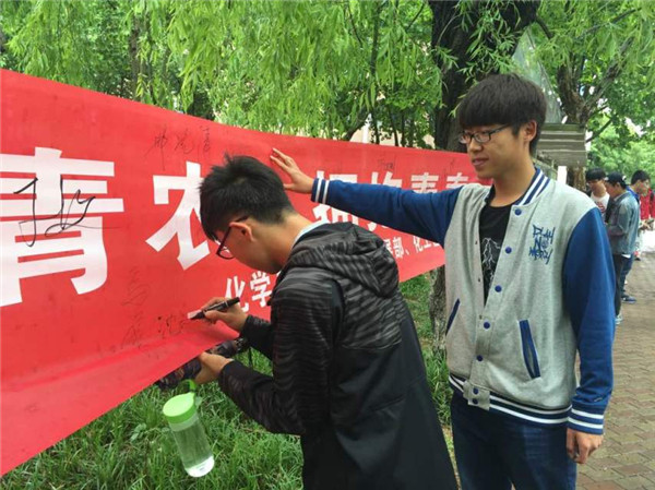 活动中,由工作人员街头随机采访,被采访同学要交流自身对心理健康节认识了解并回答心理健康和心理学相关小问题,通过这一方法推进心理健康知识的普及,达到宣传心理健康节的效果。参与活动的同学在印有“相遇青农,相拥青春”的横幅上签名并发表宣言,“了解自己,真正懂自己,做最适合自己的事;接纳别人,学会信任宽容,做一个充满阳光的人--李新潮”, 应用化学专业李新潮在宣传横幅上写道。