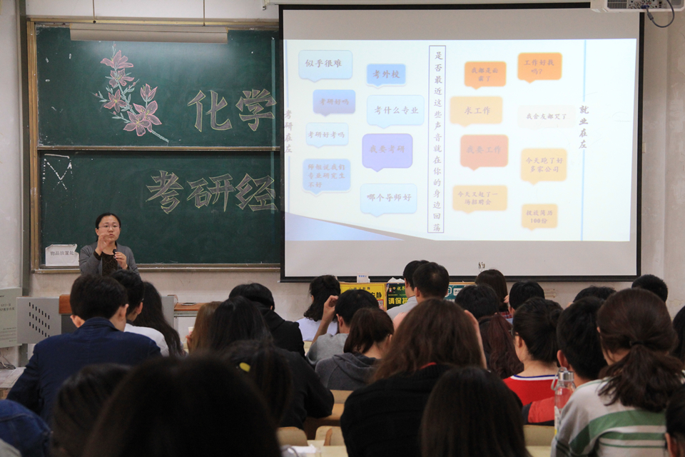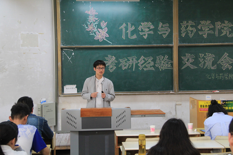 4月16日,化学与药学院于教学区举办考研动员会暨“你言我语,共话考研”经验交流会。本次会议分两个会场同时进行,学院团委书记王海霞、正科级辅导员田保玲担任主讲作考研动员报告;会议邀请学院考入华东理工大学、吉林大学、华中农业大学、燕山大学、中国石油大学的李延娣、乔治、邵晓艳、朱媛媛、王礼军、付秋菊六位优秀考研学生代表进行经验交流。学院14级、15级学生参加会议。