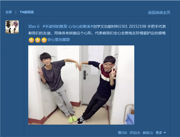 活动期间,全院同学积极响应,纷纷通过QQ空间表达自己内心的情感。功能材料1501刘学文这样写到:“手把手代表着我们的友谊,用身体来拼接这个心形,代表着我们全心全意地去珍惜爱护这份感情。”