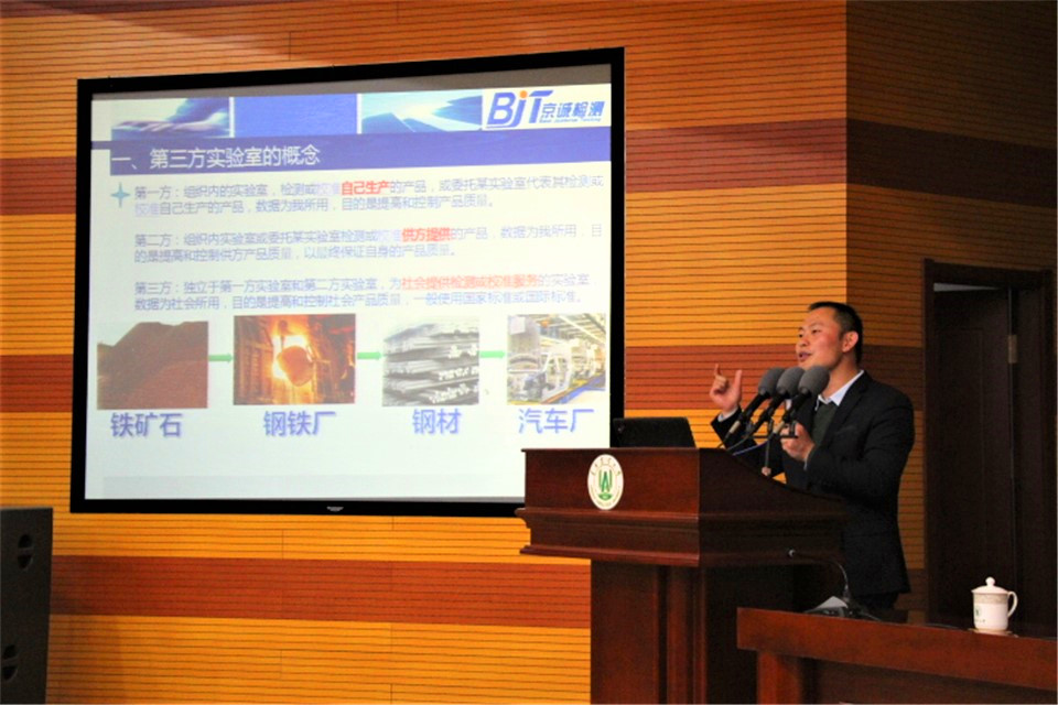 课上,胡国栋以PPT的形式向同学们简单介绍第三方检测公司的历史沿革,并就检测相关内容及公司发展概况、人才需求进行详细的讲解。胡国栋对京诚检测班同学提出要求,同学们要树立与时俱进的思想,紧跟行业发展步伐,通过网络、新闻、学术报刊等及时关注和了解行业动态;努力学好专业知识,提高专业技能和职业素养,将来为行业发展做出贡献。