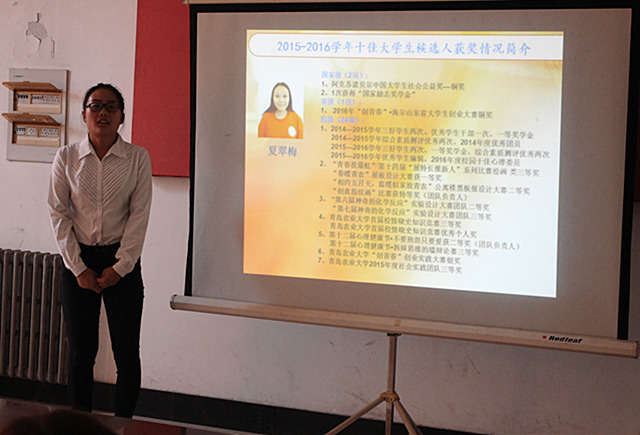 答辩中,13位候选人通过PPT依次介绍个人的基本信息和获奖荣誉,展示自身在学习、数学建模、社会实践、志愿服务等方面的成绩和事迹。候选人朱媛媛就自身学习方面、社会志愿方面等等方面进行介绍:6次被评为校级“三好学生”,3次获得一等奖学金;担任校友志愿者协会秘书长、多次参加志愿活动,走访校友,获得第四届阿克苏诺贝尔中国大学生社会公益奖铜奖,2次获评“优秀志愿者”;参加多项实验设计技能方面大赛并取得青岛农业大学第七届化学实验技能大赛三等奖等种种事迹引起现场一阵热烈的掌声。