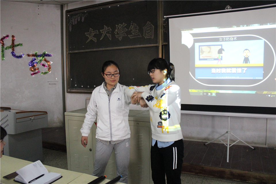 春蕾协会6名成员上台为同学演示防狼技巧,如擒拿,踩脚、勒脖子、捣肋骨等,招式简单实用,利用女子的柔韧性以柔克刚,保障自身安全。同学们在学习过程中热情高涨,并对一些动作技巧提出疑问,示范者耐心的进行详细解答,并强调面对危险处境时,不要激怒歹徒,尽量顺着歹徒的话做,保障生命安全,伺机而动,摆脱困境。