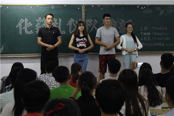 9月18日,化学与药学院在教学区举办了礼仪队纳新活动,100余位大一新生参加竞选。本次纳新由学生会各部门部长及礼仪队全体成员担任评委,由女生部部长尹姗姗主持。