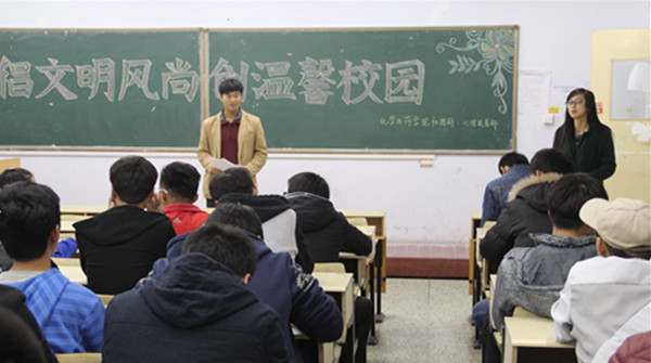 会议伊始,社团部实习干事王凯毅向同学们详细的讲解了“八个倡导,四个禁止”的主要内容,即“倡导尊师重教,倡导课堂守纪,倡导诚信考试,倡导交通守则,倡导爱护环境,倡导节约水电,倡导文明交往,倡导文明着装;禁止践踏草坪,禁止乱涂乱画,禁止餐进教室,禁止乱扔垃圾”随后,他与在场同学从教学区、食堂、校园、宿舍等方面全方位的解读了《大学生文明准则》,他强调到:“在场每位同学都要严格遵守文明准则中各项内容,从自身做起,从小事做起,时刻严格要求自己,做一名文明大学生。”