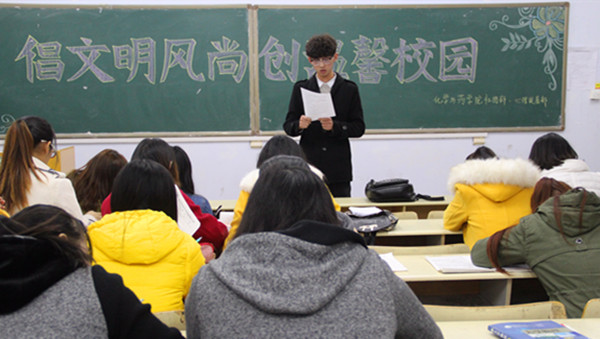 11月15日,化学与药学院于教学区举办“倡文明风尚,创温馨校园”主题教育活动。本次活动主要围绕“八个倡导,四个禁止”开展,旨在进一步加强学院学生思想道德建设,促进全体同学基础文明养成,全面提高学生的综合素质。社团部部长李延娣、心理发展部部长陈超以及学院全体同学到场参加。