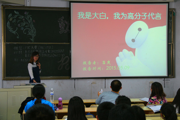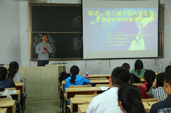 大会伊始,牛永盛分别从PMC基本情况、前两届PMC回顾、申报注意事项三大方面向在场同学进行了详细得讲解说明。他讲,PMC大赛是一个以“创新创业——中国化工新材料”为主题,以“原创性、先进性、实用性”为原则的赛事。在PMC大赛回顾中,他向同学们详细地列举了前两届大赛具体状况和获奖信息,并就申报课题与同学们进行了深入的探讨和分析。他通过前两届参赛队伍取得的优异成果鼓励同学们积极报名参加。“前两届大赛的成功举办充分显示了其规模之大,大赛不仅吸引了来自全国各地的大学参赛队伍,也吸引了国际目光。上届比赛中,俄罗斯代表队积极参与比赛并取得了成绩。希望有兴趣的同学大胆尝试、积极报名参加。”牛永盛讲道。