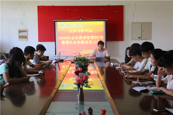 7月11日,化学与药学院于学院会议室举办2015社会实践表彰暨2016暑期社会实践动员大会。学院党委副书记史雪辉、团委副书记杨冬冬出席会议并发表讲话,学院各社会实践团队负责人与会。