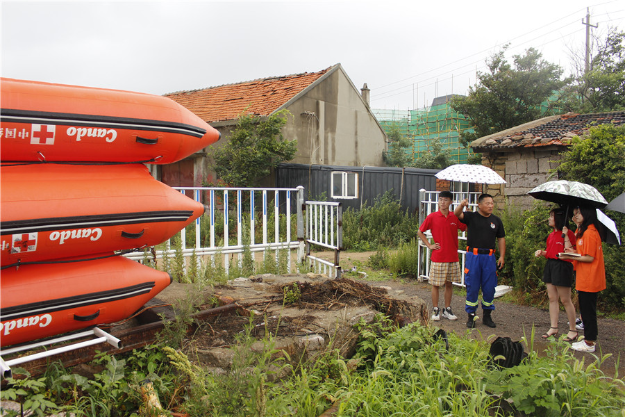 蓝天红十字救援基地队长为学生队员讲解冲锋舟、摩托艇与自制救援艇的不同
