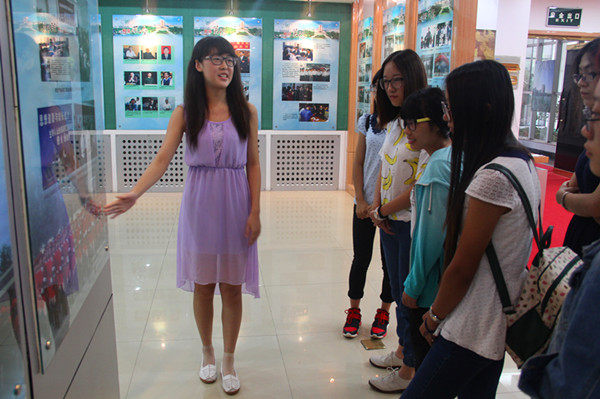 解说员曹佳琪在校史馆向新生介绍了学校的一些发展历程、科研成果和风云人物,并希望大家早点了解大学,为学校的发展做贡献。