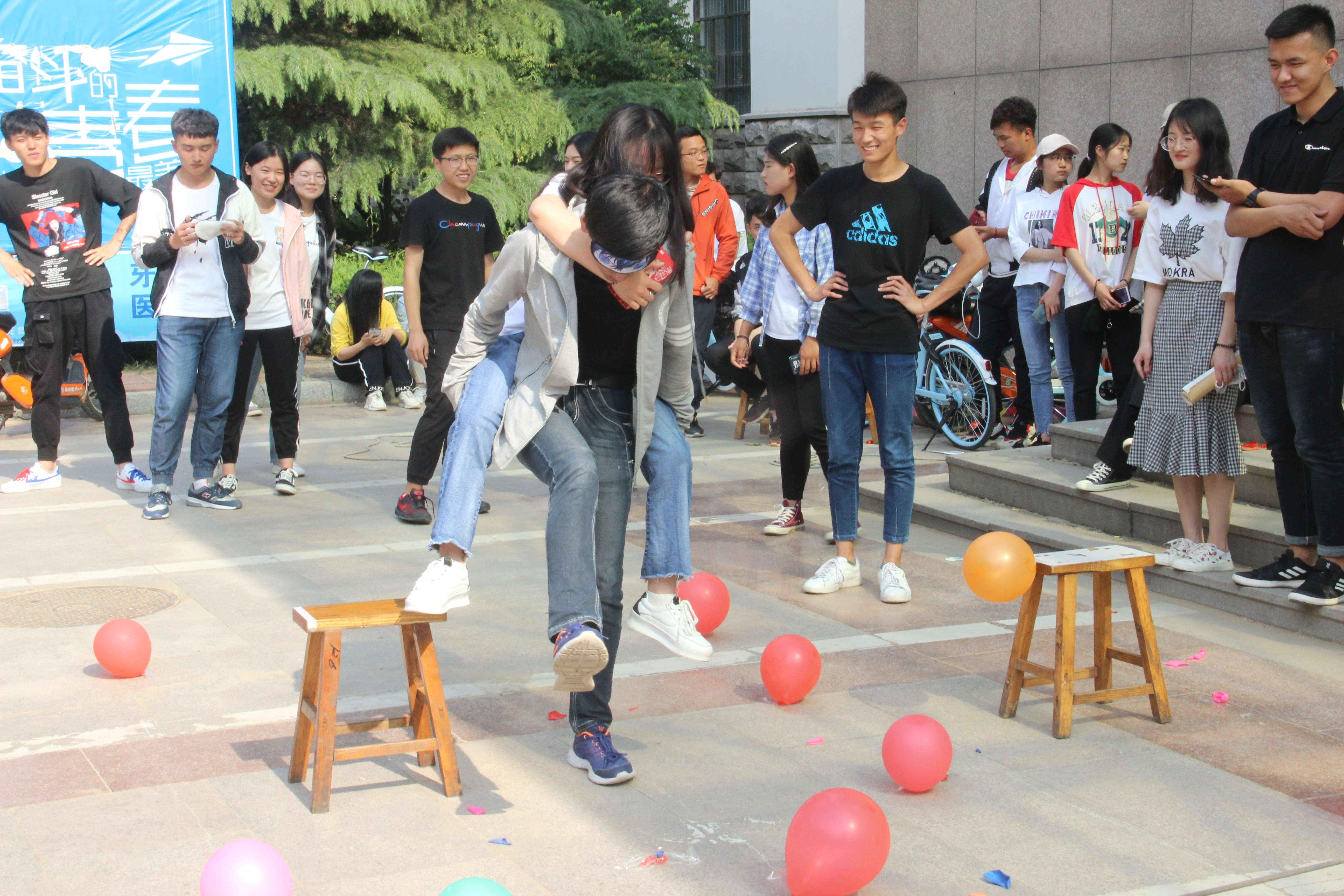 在“你是我的眼”环节中,男生背起女生,带眼罩越过障碍,功能材料1802班同学齐心协力,在没有踩到气球的情况下完成比赛,赢得全场惊叹。