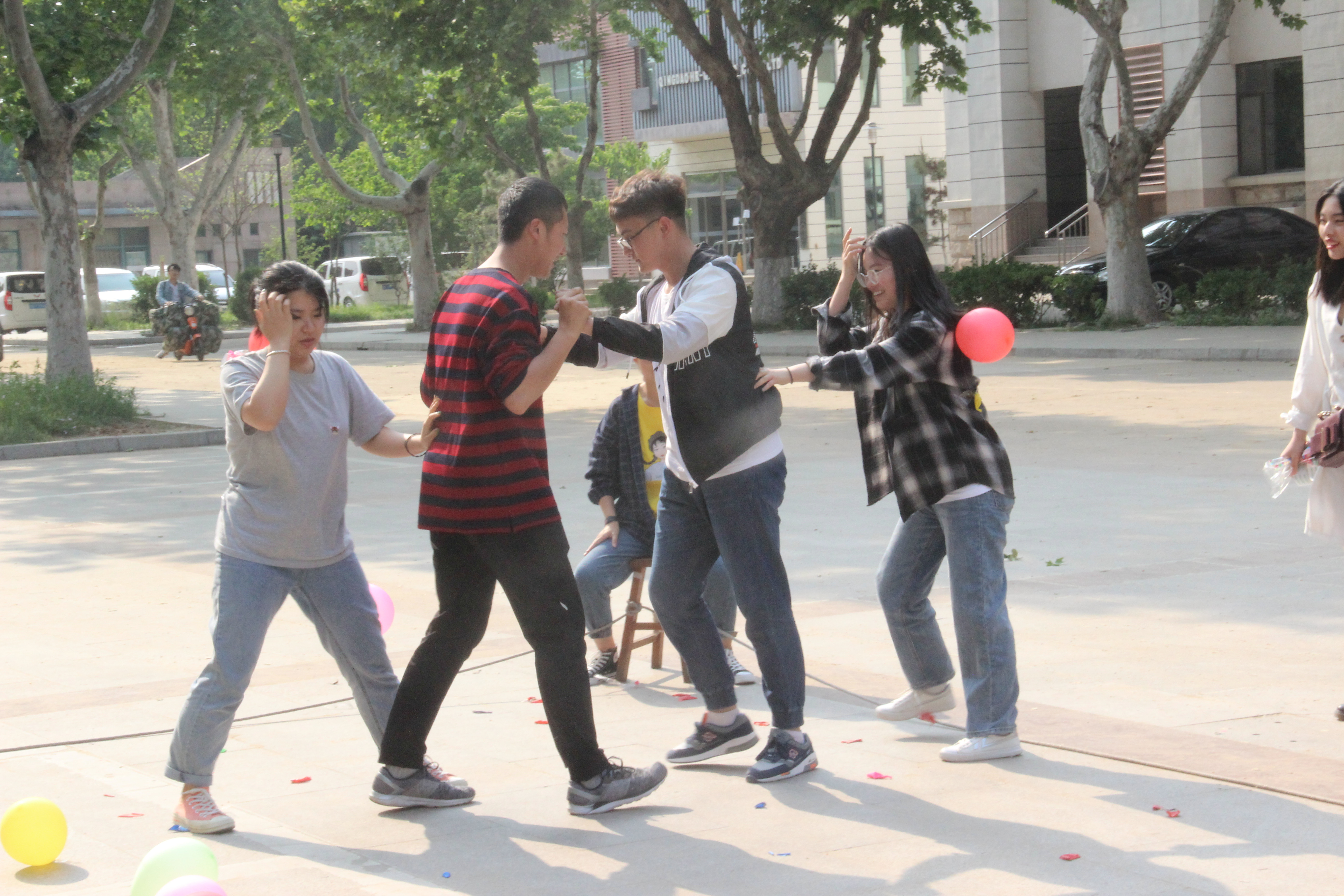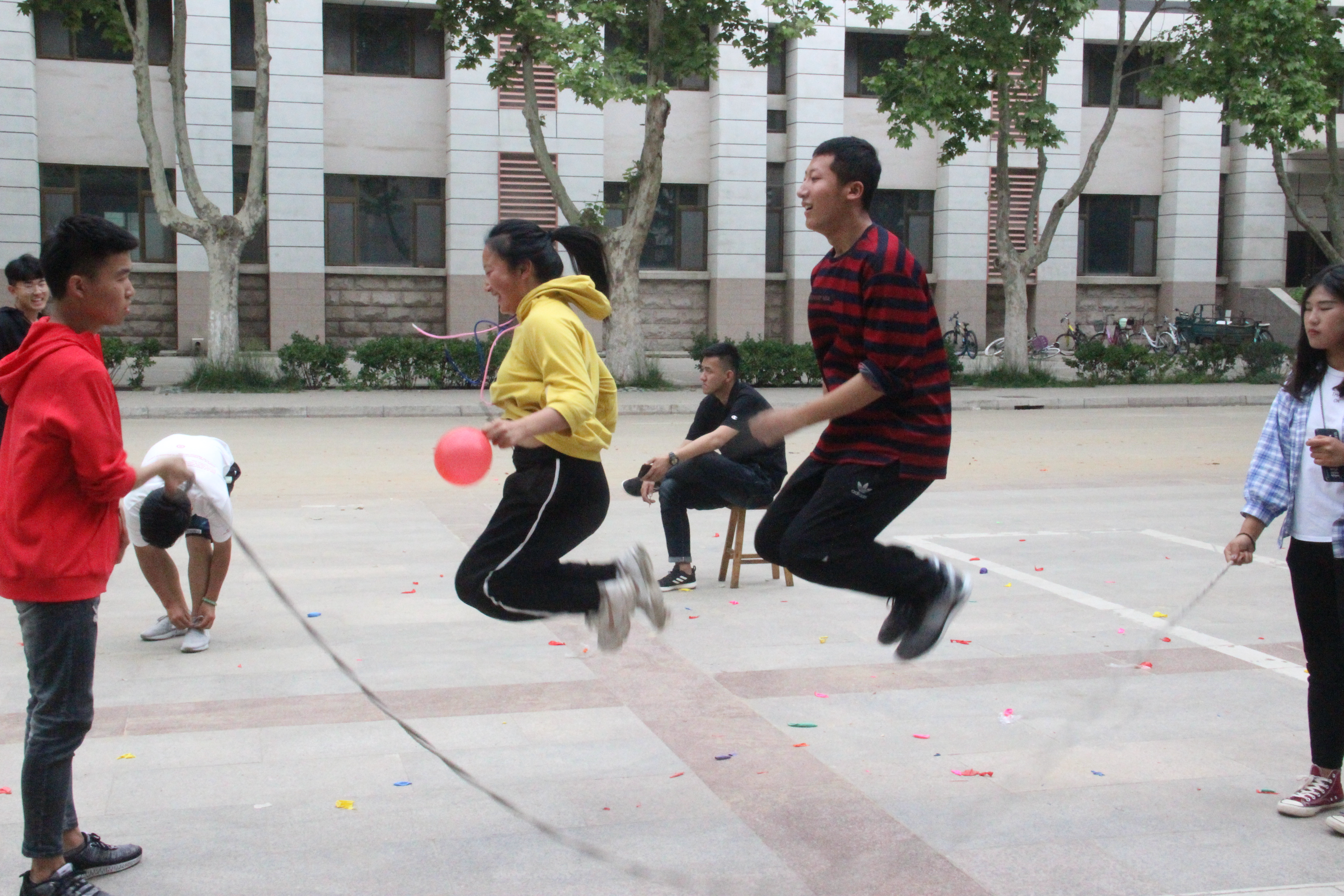 功能材料专业李雯和李俊龙在“皮皮虾我们走”中手持气球进行跳大绳活动,成功保住了手中的气球,并在跳绳结束后成功捏爆,取得本场比赛第三名的成绩。