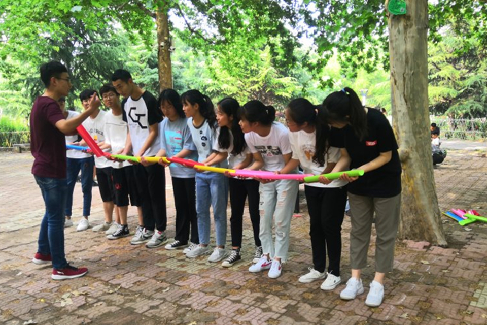 首先,各分队负责人领取一面彩旗,在25分钟内为自己的团队设计队徽、口号等,依次上台展示。接着,各分队依次进行“同心鼓”、“不倒森林”、“珠行万里”、“跳大绳”、“气震山河”等游戏,每个队伍一次性进行完五项游戏,裁判员记录总用时。经过激烈的竞争,德州陵城支教队以总用时4分51秒的成绩取得一等奖,获得400元奖金,青岛、菏泽支教队取得二等奖获200元奖金,德州夏津、临沂支教队取得三等奖获100元奖金。游戏结束后,全体队员前往主楼前合照留念。