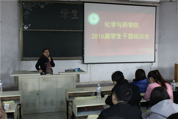 10月30日,化学与药学院学生干部培训会于教学区举行,院团委书记王海霞、正科级辅导员田保玲与会。校学生会常务副主席兼校新闻中心主任潘婷、国旗护卫队团支部书记付恩羽出席,与学院全体学生干部分享作为学生干部的成长历程。