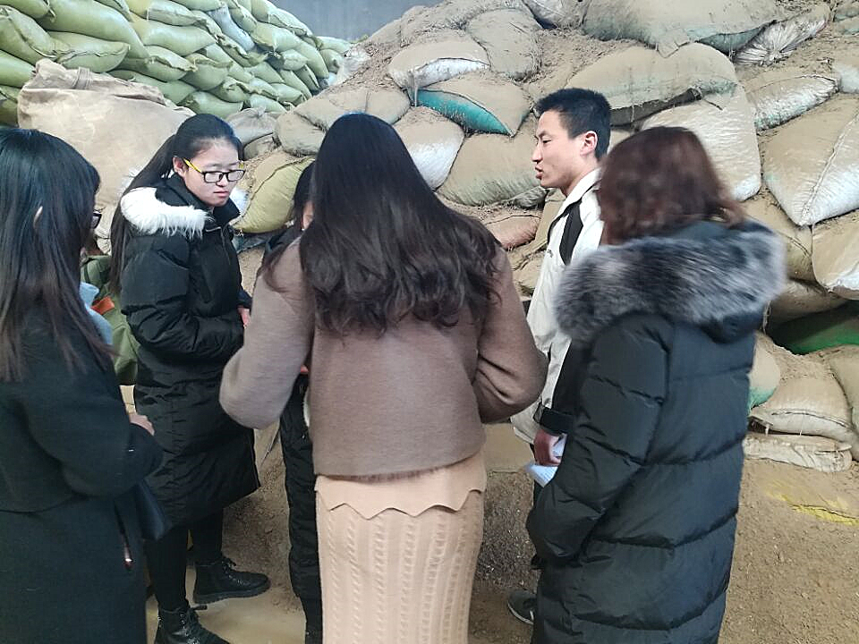 调研前期,队员联系当地农业局,通过引荐前往红岛青岛天地缘生物技术开发有限公司和棘洪滩八福仙有机肥公司展开调研。到达目的地后,调研队在公司负责人的带领下进入厂区考察,了解生产运作流程,参观原料室。调研队参观了有机肥生产流水线,貂粪及其他动物排泄物通过露天放置自行发酵和机器翻转升温等工艺制成有机肥,原料在生产过程中进行无公害处理,降低肥料对环境的污染。公司内配备专业实验室,使用重量法对化肥氮磷钾的含量进行测定。