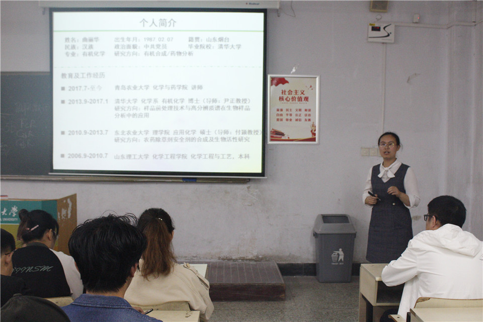 5月16日,青岛农业大学化学与药学院于教学区举行立德树人大讲堂之博士论坛。讲座由学院团委书记王海霞主持,学院学生代表参加。本期论坛的主讲人是生物制药技术与应用团队曲丽华博士、理论计算与模拟团队刘丙萍博士。