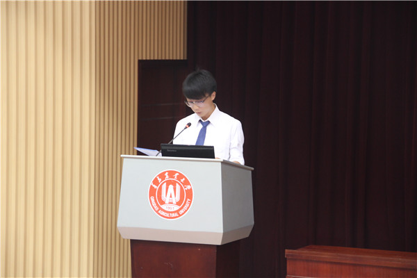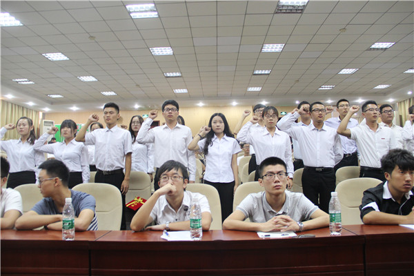“承服务同学为宗旨,引爱校荣院之风尚,怀追求卓越之宏志,担继往开来之大任。”学院2016届学生会主席王飞带领2016届学生会各部部长庄严宣誓,并承诺带领新一届学生会挑起重担,做学院良好作风的开拓者、继承者和实践者。