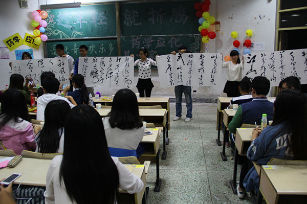 热闹的歌舞表演,让同学们赏心悦目。韩焕凯的书法展示则是震惊四座。笔法行云流水,一气呵成,让台下观众目瞪口呆。在观众们的注视下,一首《沁园春》跃然纸上,同时也引来了晚会的“抢纸热”。节目最后,韩焕凯说道:“学生的天职就是学习,希望学弟学妹们在大学期间也不要放松对自己对学习的要求,努力找好自己的位置。”