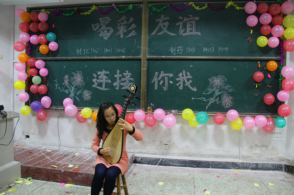 主持人精彩的开场白,为愉快的联谊气氛做好了铺垫。一首首美妙的歌曲,让台下观众喝彩不断。其中,姚星辰和梁代付带来的吉他弹唱《斑马斑马》为联谊引来了高潮。他们手抱吉他,深情演唱为联谊晚会增添一抹深情而亮丽的色彩。苏娜的琵琶独奏《阳春白雪》,曲调悠扬,委婉动听,曲毕,雷鸣的掌声在室内回荡。在新生们精彩的表演过后,院学生会文艺部部长隋明俊的《一剪梅》赢得大家齐声喝彩。材化班助李永哲则以一曲《有没有人曾告诉你》一改往日严肃形象,走上讲台,深情献唱。