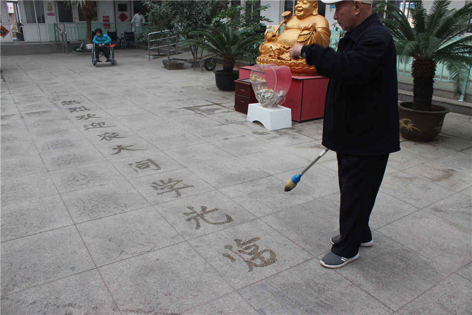 “你们年纪轻轻来到青岛读大学,好好学习是最重要的。在课余时间可以勤工俭学,做点劳动赚些钱出来玩玩,欣赏欣赏美丽的青岛。”胡振宇嘱咐学生。随后,胡振宇拿起海绵笔,为学生展示他的绝技——地书。