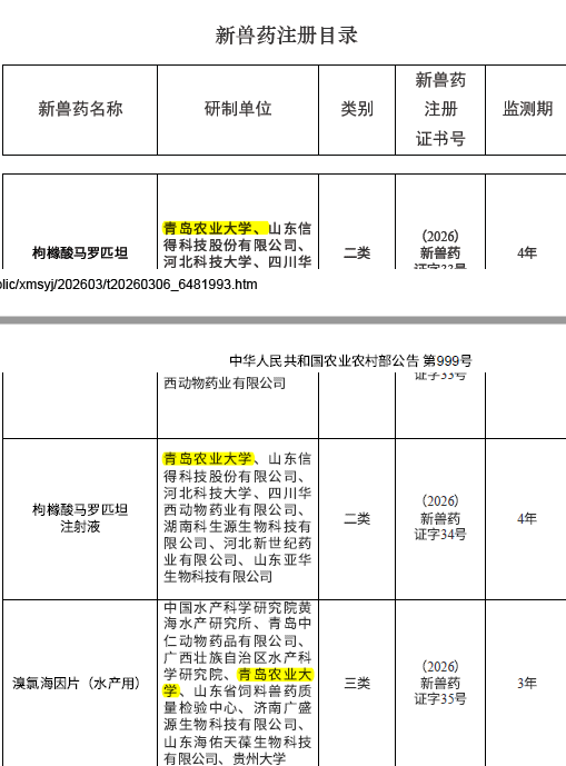 近日,农业农村部正式发布第981号、999号公告,由青岛农业大学化学与药学院李秋教授牵头,联合山东信得科技、黄海所等国内知名企事业单位协同攻关研发的三款新兽药,成功通过国家审定,斩获国家新兽药证书,标志着我校在兽药研发与成果转化领域再添重要成果,为行业高质量发展注入新动能。