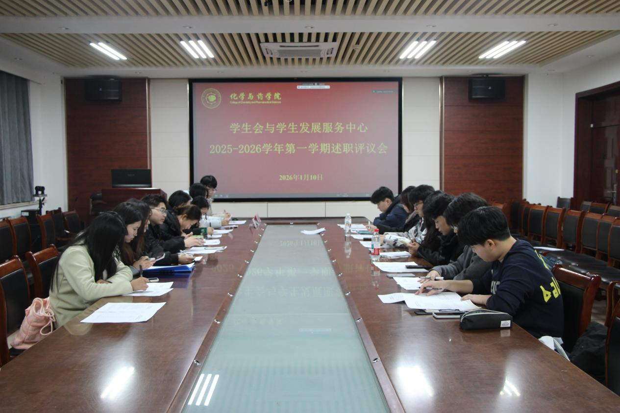 1月10日,化学与药学院于化学楼会议室召开学生会暨学生发展服务中心2025-2026学年第一学期述职评议会。会议由学院学生会执行主席张开岩主持,学院团委书记赵莹线上参会,校学生会主席团成员李德凡、校新媒体中心主任唐心怡应邀出席,院学生会及学生发展中心骨干成员参加会议。