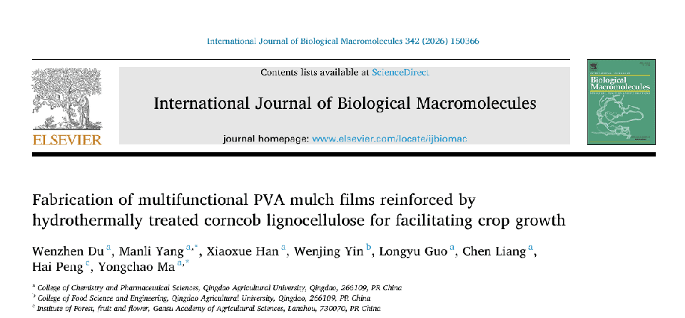 近日,青岛农业大学化学与药学院“低碳与绿色农业化学”团队在农用功能地膜材料领域取得重要突破。研究成果以Fabrication of multifunctional PVA mulch films reinforced by hydrothermally treated corncob lignocellulose for facilitating crop growth为题,发表于国际知名期刊International Journal of Biological Macromolecules。该研究为破解传统地膜“高污染、高成本、功能单一”难题提供了创新解决方案,有力推动了作物栽培技术向绿色、低碳、可持续方向升级。