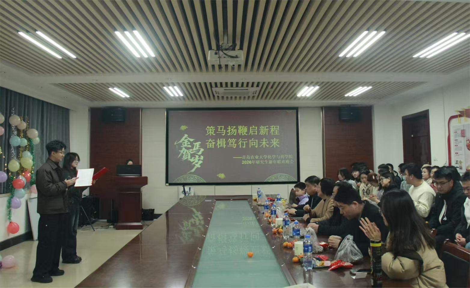 12月29日,化学与药学院于化学楼207会议室举办以“策马扬鞭启新程 奋力急鞭向未来”为主题的2026年研究生元旦晚会。院长龚良玉、副院长徐鲁斌、党委副书记刘兴华、李帅帅教授及辅导员辛鑫老师出席活动,与全院研究生欢聚一堂,共迎新年。