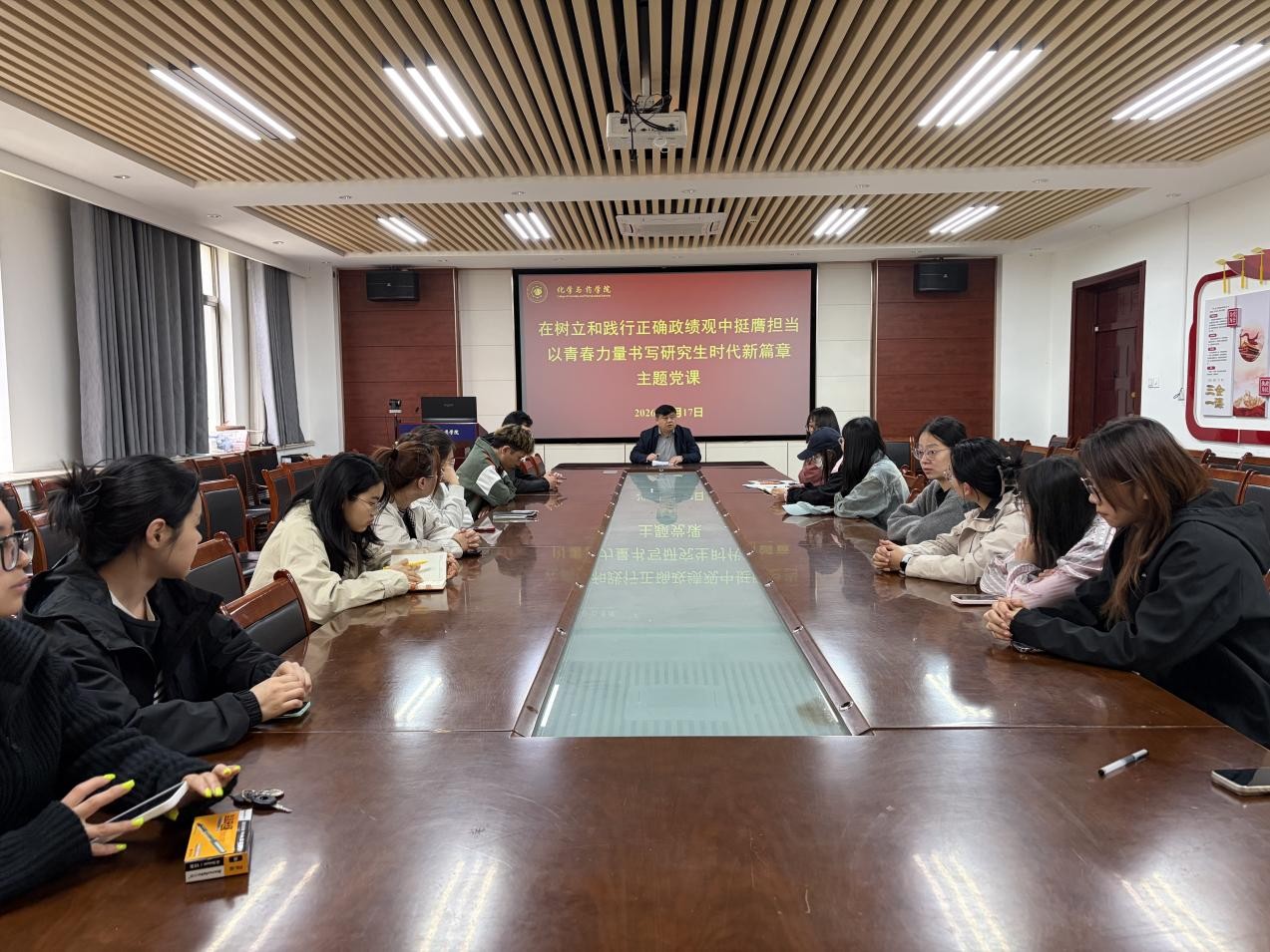 4月17日,化学与药学院第六(研究生)党支部于化学楼会议室开展“在树立和践行正确政绩观中挺膺担当 以青春力量书写研究生时代新篇章”主题党课学习,此次党课由学院副院长徐鲁斌主讲,支部全体党员参加。