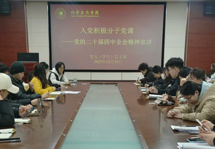 为深入学习贯彻党的二十届四中全会精神,推动全会精神在基层落地生根,引导学生党员将理论学习与专业发展、时代使命紧密结合,12月15日,化学与药学院第五(学生)党支部在化学楼207会议室举办党的二十届四中全会精神宣讲会。会议由党支部书记黄海红主讲,支部全体党员和入党积极分子参加学习。